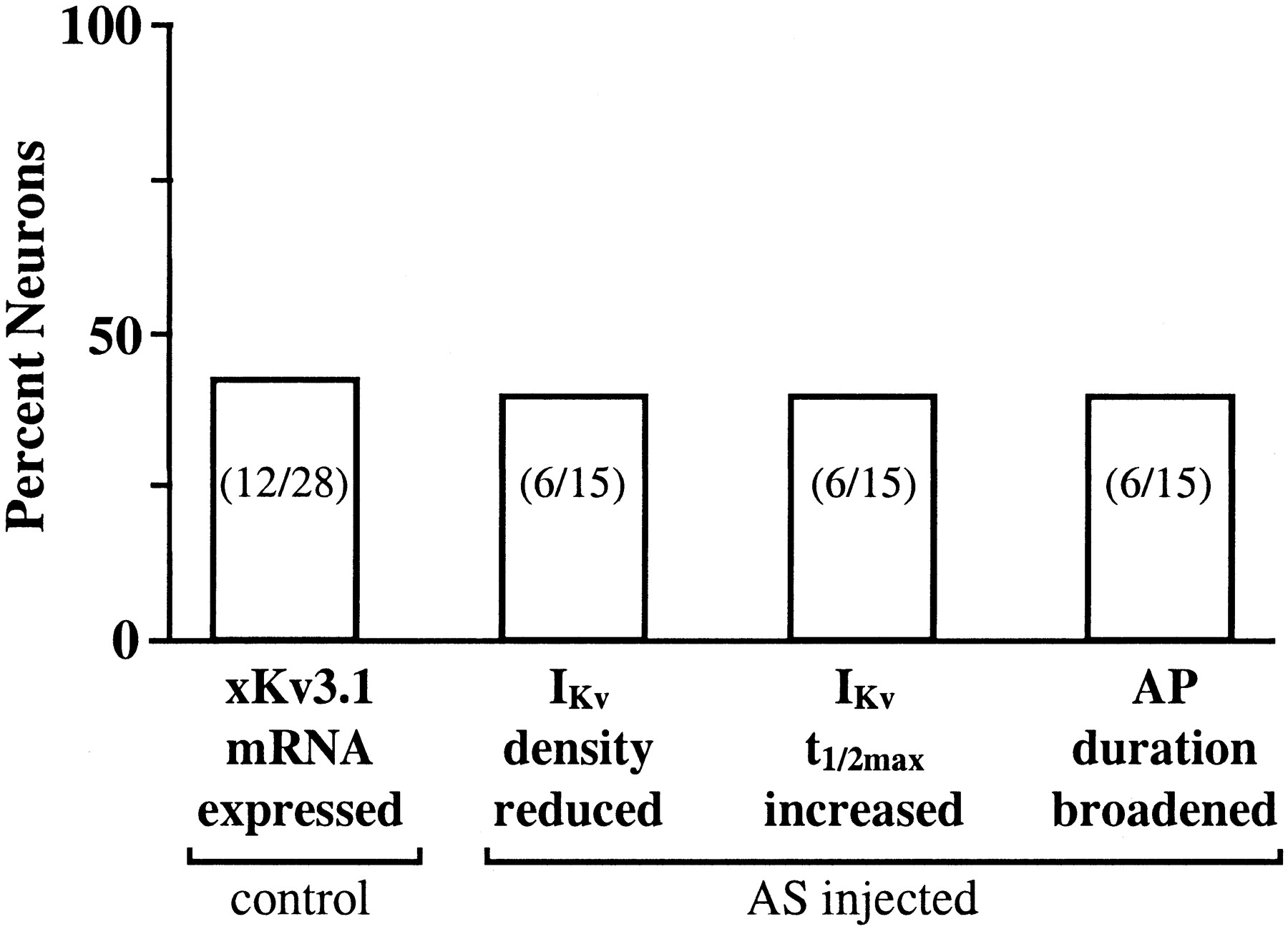 The percentage of neurons in whichI Kv and APs are affected byxKv3.1 AS is similar to the percentage of neurons previously shown to express xKv3.1 transcripts (Gurantz et al., 2000). Numbers in parenthesesindicate the number of neurons affected/tested for each condition.