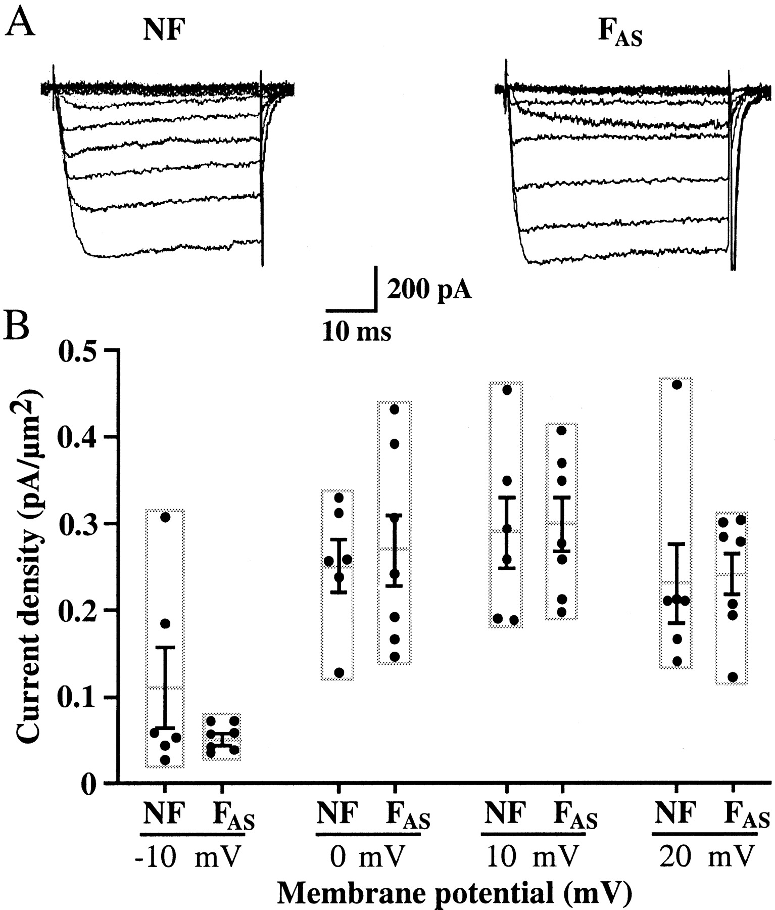 I Ca is not affected by the expression of xKv3.1 AS. A, Whole-cell voltage-clamp records of low voltage-activated and high voltage-activated calcium currents; potassium and sodium currents were suppressed pharmacologically. The records are from two neurons at 1 d in culture. Cells were held at −80 mV and stepped to potentials from −50 to +20 mV. B, Current densities for NF and FAS neurons. The records are from six and seven neurons at 1 d in culture. Conventions are as in Figure4. Mean I Ca is not significantly different for these two populations. The apparent reduction in the density of calcium current at −10 mV likely reflects outliers in the NF population.