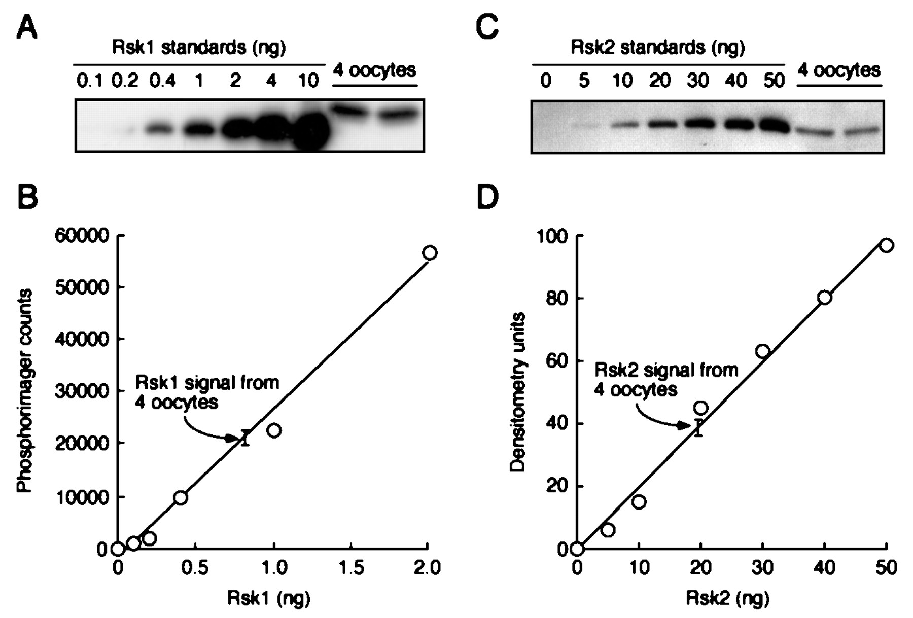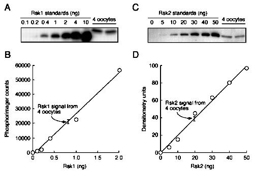 The abundance of Rsk1 and Rsk2 in oocytes. Recombinant Δ43-His6-Rsk1 and His6-Rsk2 were purified and used as standards for Rsk1 and Rsk2 blots. A, Rsk1 blot of Δ43-His6-Rsk1 standards and lysates equivalent to four oocytes per lane.B, quantitative data from phosphorimaging analysis of the blot shown in A. C, Rsk2 blot of His6-Rsk2 standards and lysates equivalent to four oocytes per lane. D, quantitative data from densitometry of the blot shown in C.