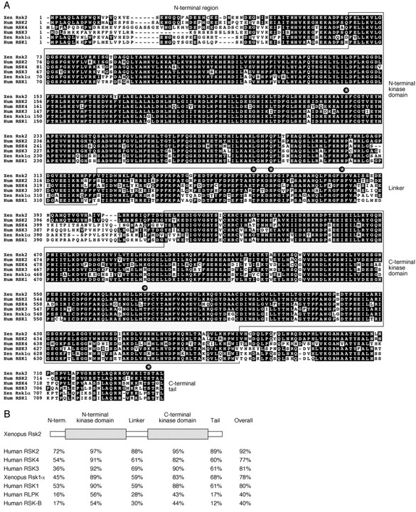 The cDNA sequence of XenopusRsk2. A, the predicted amino acid sequence of theXenopus Rsk2, human RSK2, human RSK3, XenopusRsk1α, and human RSK1. Sequences were aligned using ClustalW 1.8 on the Baylor College of Medicine multiple sequence alignment server on the Web. Minor adjustments to the alignment were made manually. The highlighted residues (white letters on black backgrounds) are those that are conserved betweenXenopus Rsk2 and one or more of the other Rsk sequences. Thegray boxes denote the N-terminal and C-terminal kinase domains. The circled asterisks denote the phosphorylation sites identified by Dalby et al. (31). B, percentage identities between Xenopus Rsk2 and various other Rsk isozymes.