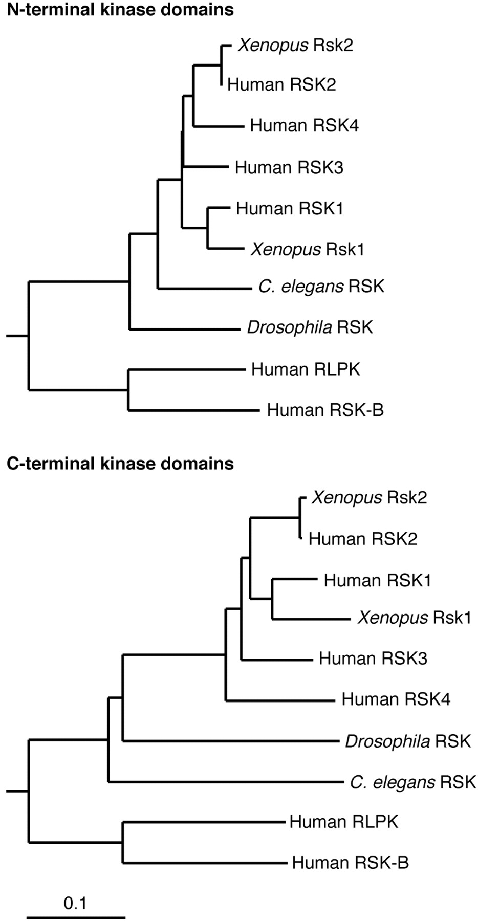 Phylogram trees for the Rsk N-terminal and C-terminal kinase domains. Neighbor-joining trees were generated from the kinase domain alignments shown in Fig. 1 by means of the Macintosh version of ClustalX. The N-terminal and C-terminal kinase domains are plotted on the same scale. The scale barrepresents 0.1 differences per site.