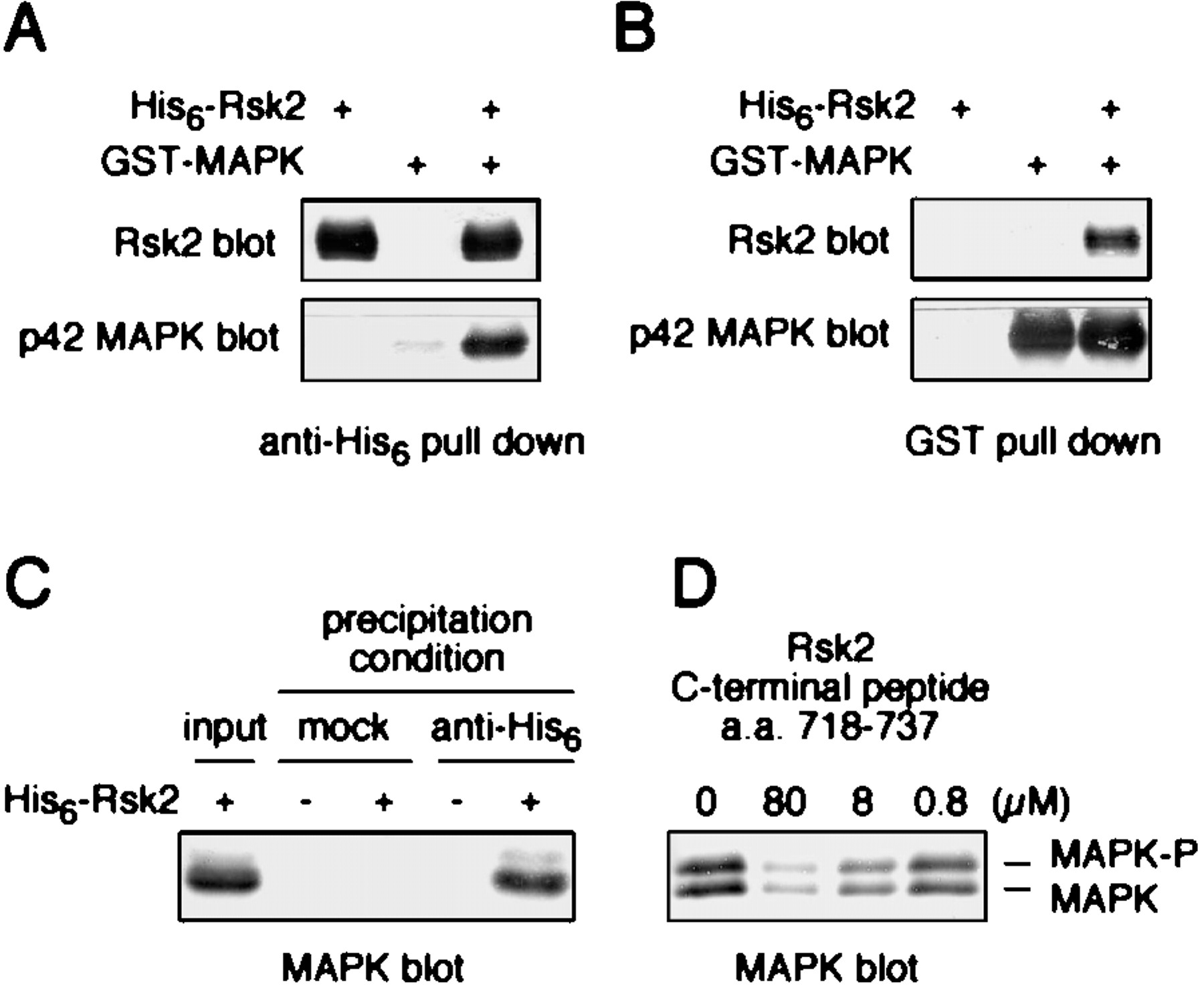Complex formation between Rsk2 and p42 MAPK. A, p42 MAPK is pulled down with Rsk2. Lysates from Sf9 cells expressing either His6-Rsk2 or GST·MAPK were combined and incubated at 4 °C for 90 min with protein G-agarose beads and anti-His6 antibodies, both individually and together. His6-Rsk2 and any Rsk2-associated proteins were pulled down with anti-His6antibodies. The immunoprecipitates were then immunoblotted for Rsk2 and p42 MAPK. B, Rsk2 was pulled down with p42 MAPK. Lysates from Sf9 cells expressing His6-Rsk2 or GST·MAPK were combined with glutathione-agarose beads both individually and together and processed as in A. C, binding of endogenous Xenopus p42 MAPK to His6-Rsk2. G2 phase Xenopus oocyte lysates were incubated for 20 min at 4 °C in the presence or absence of purifiedXenopus His6-Rsk2 protein. These lysates were then incubated with protein G-agarose beads in the presence and absence of anti-His6 antibody and incubated for 90 min at 4 °C. The first lane represents the total lysate used in each immunoprecipitation. After centrifugation and washing, the beads were resuspended in sample buffer and resolved by 10.5% SDS-PAGE, followed by p42 MAPK immunoblotting. D, Xenopus egg extracts containing both phosphorylated and unphosphorylated MAPK were treated similarly to C except that lysates were preincubated in the presence or absence of a Rsk2 C-terminal peptide for 10 min at 22 °C prior to adding His6-Rsk2 protein. Beads were collected by centrifugation, washed, and processed as inC.