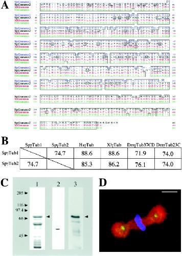 Figure 4. Two different γ-tubulin isoforms (SpGamma1 and SpGamma2) are found in sea urchin (S. purpuratus) eggs and early embryos. (A) A lineup of the deduced amino acid sequences of four different γ-tubulins found in sea urchin (SpGamma1 and SpGamma2), Xenopus (XlGamma), and human (HsGamma). Identical amino acids between the four γ-tubulins are surrounded with black boxes. The nucleotide sequences of SpGamma1 and 2 are available from GenBank under accession numbers AF284334 and AF284335. (B) Both sea urchin γ-tubulin isoforms (SpγTub1 and SpγTub2) are related to the γ-tubulins found in human (HsγTub), Xenopus (XlγTub), and the two isoforms in Drosophila (DmγTub37CD and DmγTub23C). The overall percentage of identity that these tubulins share are compared. (C) Purified, recombinant full-length GST-SpGamma2 fusion protein runs at 70 kD upon Coomassie-stained SDS-7.5% PAGE (lane 1). Affinity-purified anti–γ-tubulin antibody specifically recognized γ-tubulin in sea urchin (HSS) egg extract (lane 2) and the SpGamma2 fusion protein (lane 3) by Western blot. The GST-SpGamma2 fusion protein is indicated by the arrowheads and the molecular mass markers correspond to all three lanes. (D) A triple-labeled merged confocal micrograph shows a pre-extracted metaphase sea urchin embryo fixed and stained with anti–γ-tubulin (green), anti–α-tubulin (red) antibodies, and DAPI (blue). Bar, 10 mm.