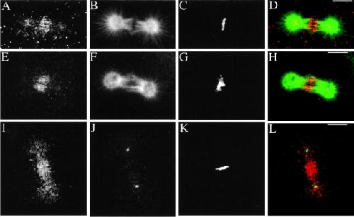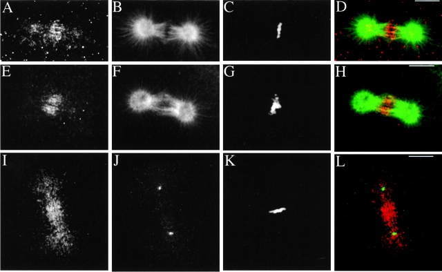Figure 5. KRP180 does not coimmunolocalize to the centrosome with γ-tubulin in one-cell cleavage stage sea urchin (S. purpuratus) embryos. Pre-extracted metaphase embryos were fixed and stained with anti-KRP180 (A, E, and I) and either an FITC-conjugated anti–α-tubulin antibody (B and F) or an anti–γ-tubulin peptide antibody (J). DNA was visualized with (1 μg/ml) DAPI (C, G, and K). Merged images are shown with KRP180 in red and tubulin in green. Bar, 10 μm.