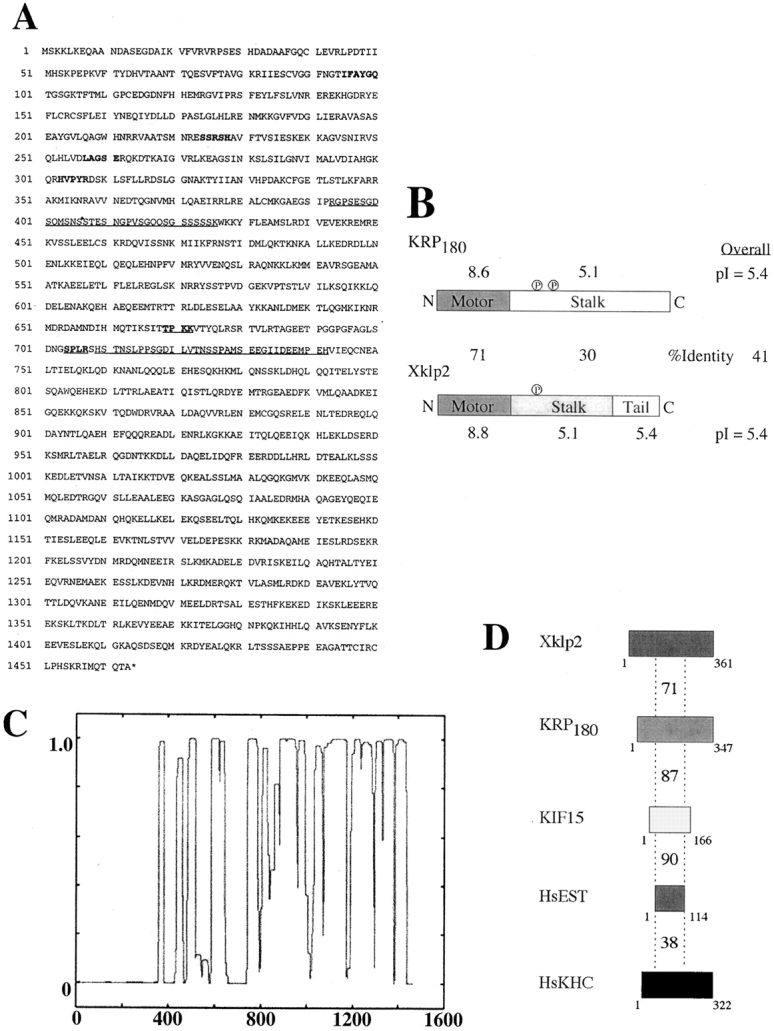Figure 1. Molecular analysis of sea urchin KRP180. (A) The deduced amino acid sequence of KRP180 encodes an NH2-terminal motor polypeptide 1,463 amino acid residues long. Amino acids in bold correspond to the hyperconserved motor sequences found in kinesin motor domains. PEST sequences are shown as underscored amino acids. Underscored and bold amino acids correspond to consensus p34cdc2 kinase phosphorylation sites. The nucleotide sequence of KRP180 is available from GenBank under accession number AF28433. (B) Aligned linear maps of the motor polypeptides KRP180 and Xklp2 demonstrate the conservation of sequence identity and isoelectric point values in their domain organization. Consensus p34cdc2 kinase phosphorylation sites are shown as a circled letter P. Sequence identity scores are shown as percentages between the linear maps, isoelectric point values are shown above and below the linear maps, and overall scores are shown on the right. (C) KRP180 forms an extensive region of α-helical coiled-coil as determined in a Lupus plot using the Coils program (Lupus et al. 1991). (D) Linear maps of the full-length and partial motor domains of the Xklp2 members found in Xenopus (Xklp2), sea urchin (KRP180), mouse (KIF15), and human (HsEST), as well as the motor domain of human conventional kinesin heavy chain (HsKHC) demonstrate a region in the catalytic core of the motors, equal to the size of the smallest of the motors shown (HsEST), share identity to the Xklp2 motor domain. Identity scores compared with Xklp2 are shown above each motor domain.