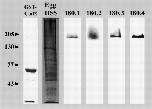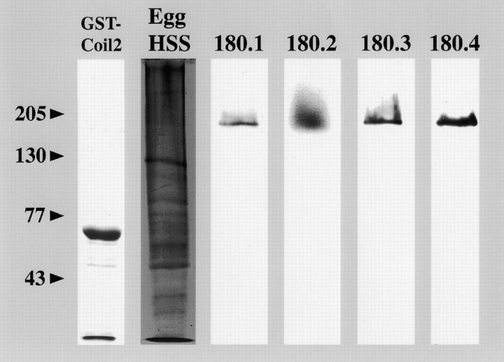 Figure 2. Anti-KRP180 antibodies specifically recognize this motor in sea urchin egg extracts. A recombinant GST-KRP180 COOH-terminal coiled-coil fusion protein was purified on a glutathione–Sepharose column (lane GST-Coil 2) and used to raise mouse polyclonal antisera. The fusion protein runs at 60 kD. Affinity-purified anti-KRP180 antibodies from four different mice all specifically recognize a polypeptide ∼180 kD in mass (lanes 180.1, 180.2, 180.3, and 180.4) found in sea urchin high speed supernatant (HSS) unfertilized egg extract (lane Egg HSS; Coomassie-stained SDS-7.5% PAGE).