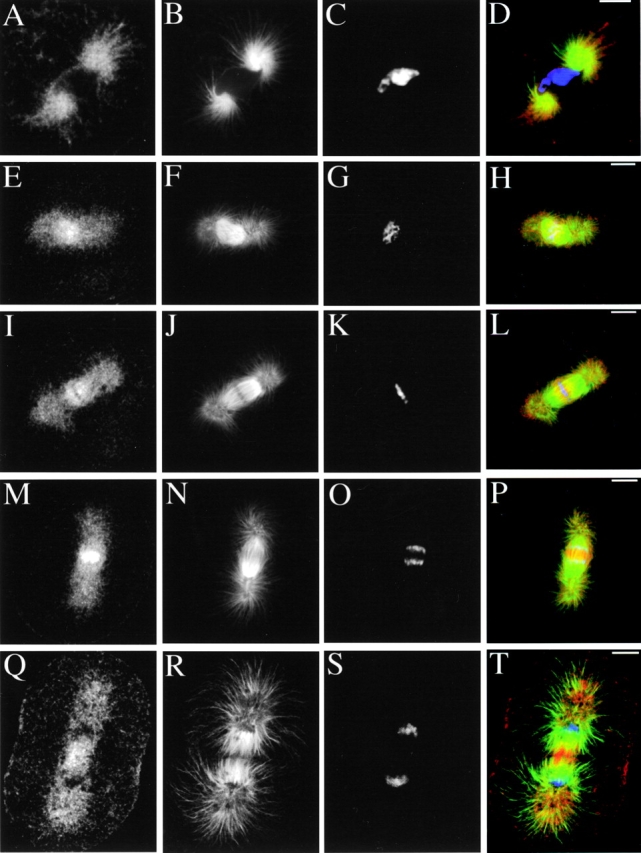 Figure 3. Immunolocalization of KRP180 in one-cell cleavage stage sea urchin (S. purpuratus) embryos. Whole embryos were methanol-fixed and stained with anti-KRP180 (A, E, I, M, and Q) and an FITC-conjugated anti–α-tubulin antibody (B, F, J, N, and R). Anti-KRP180 was recognized with Cy5-conjugated secondary antibody and DNA was visualized with (1 μg/ml) DAPI (C, G, K, O, and S). Merged images are shown with KRP180 in red, tubulin in green, and DNA in blue (D, H, L, P, and T). Prophase (A–D), prometaphase (E–H), metaphase (I–L), anaphase (M–P), and telophase/cytokinesis (Q–T). Bar, 10 μm.