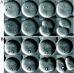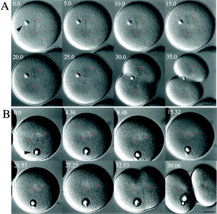 Figure 6. Effects of anti-KRP180 and control antibody microinjected into mitotic sea urchin (L. pictus) embryos. Video frames of representative control IgG (A) and anti-KRP180 (B) injected embryos are shown. The video frames (with time shown as minutes and seconds) show the effects of microinjection on first cleavage in both embryos during NEBD (time 0.0 min) until the completion of cytokinesis (time 35.0 min for control and 39.06 for experimental embryo). Both embryos were microinjected in interphase, shortly after fertilization. The center of each pole is marked with a red dot to assist in measuring spindle pole-to-pole distances. The intracellular oil droplets (arrowheads) confirm that both embryos were microinjected successfully. Bar, 20 μm.