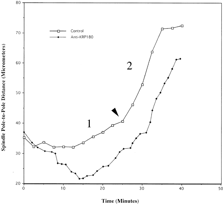 Figure 7. KRP180 is required to maintain spindle shape in prometaphase sea urchin embryos. Spindle pole-to-pole distances were measured over time in control and anti-KRP180 antibody injected embryos. Time 0 in each graph represents NEBD and the final time point in each graph indicates the completion of cytokinesis. Bold type numbers 1 and 2 indicate two distinct phases of anaphase B spindle elongation. The arrowhead indicates the transition from the first slow phase of spindle pole elongation to the second fast phase.