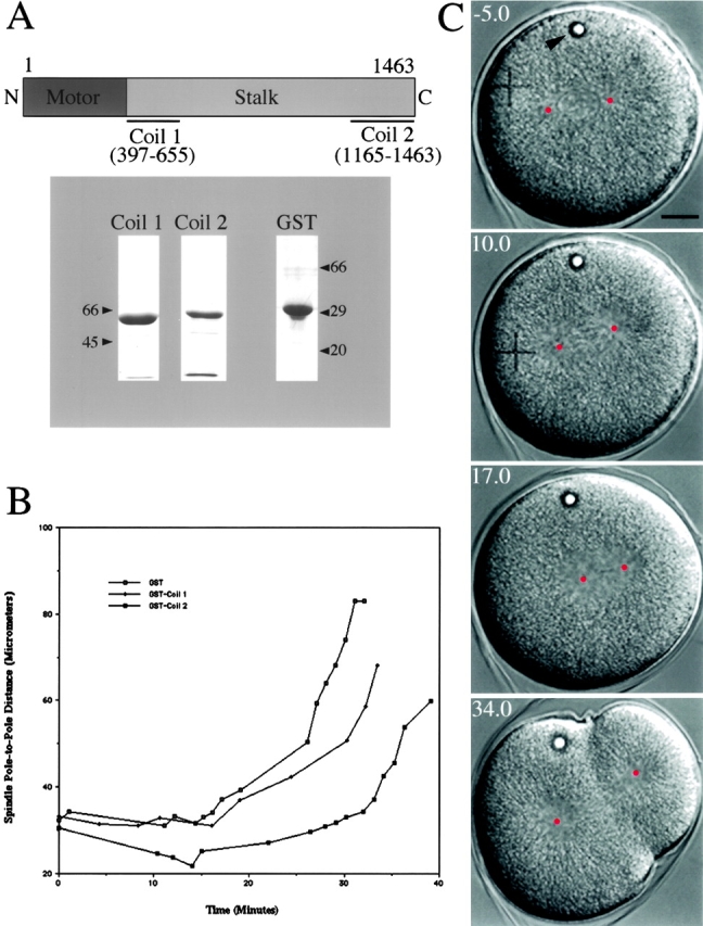 Figure 8. Effects of GST-KRP180 dominant/negative protein microinjected into mitotic sea urchin (L. pictus) embryos. (A) Purified GST-KRP180 stalk fusion proteins (Coil 1 and Coil 2) were used as dominant/negative proteins. The numbers below the linear map of the KRP180 polypeptide correspond to the amino acids that comprise the fusion proteins. Molecular mass markers indicate the size of the glutathione–Sepharose-purified fusion proteins (lane Coil 1 and 2; Coomassie-stained 7.5% and lane GST; 12% SDS-PAGE). (B) Microinjection of GST-Coil 2 into mitotic embryos perturbs the maintenance of prometaphase spindle shape, whereas microinjection of GST-Coil 1 and control GST does not. Spindle pole-to-pole distances were measured over time for individual spindles in GST-, Coil 1–, and Coil 2–injected embryos. Time 0 represents NEBD and the final time point indicates the completion of cytokinesis. Anaphase B initiates ∼15 min post-NEBD in the three spindles shown. (C) Video frames of a representative GST-Coil 2 injected embryo are shown. The video frames (with time in minutes) show the effects of microinjection on first cleavage five minutes before NEBD (time −5.0) until near the completion of cytokinesis (time 34.0). This embryo was microinjected in interphase, shortly after fertilization. The center of each spindle pole is marked with a red dot to assist in spindle length measurements while the intracellular oil droplet (arrowhead) indicates a successful microinjection. This embryo divides asymmetrically due to mispositioning of the spindle after displaying a prometaphase spindle collapse.