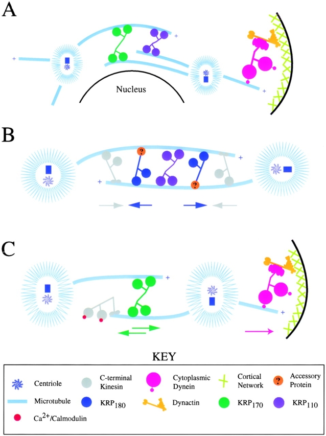 Figure 9. Proposed model describing the pathway of spindle pole positioning during embryonic cell division using the five MT-based motors: KRP180, the COOH-terminal kinesin (Kinesin-C), cytoplasmic dynein, KRP110, and KRP170. Diagrams are shown for the proposed timing and mechanisms of action during (A) prophase/spindle assembly, (B) (pro)metaphase/spindle maintenance, and (C) anaphase B/spindle elongation. Colored arrows indicate the direction of force exerted by the motor of the same color.