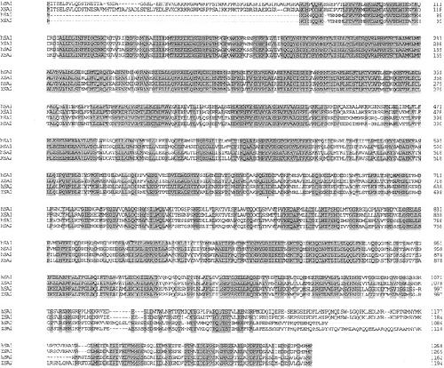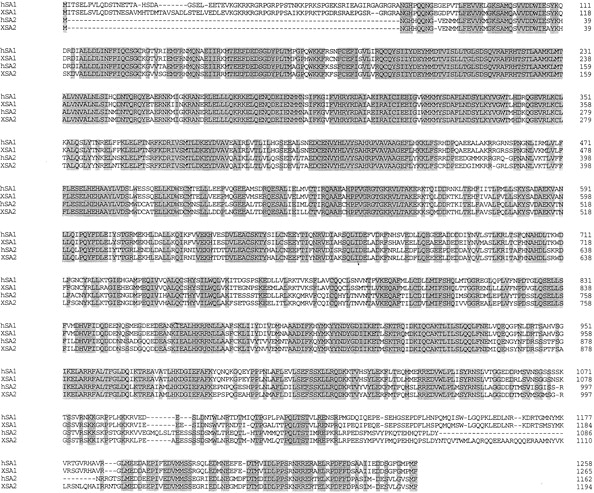 Figure 1. Sequence alignment of Xenopus and human SA1 and SA2. Identical amino acid residues are shaded. These sequence data are available from GenBank/EMBL/DDBJ under accession numbers AF255017 and AF255018.