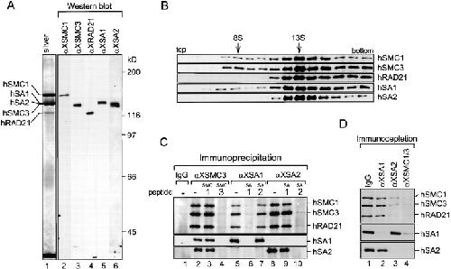 Figure 3. Biochemical characterization of the human cohesin complexes. (A) Human cohesins were affinity-purified from HeLa cell nuclear extracts using anti-XSMC3 antibodies and analyzed by silver staining (lane 1) and by immunoblotting with anti-XSMC1 (lane 2), anti-XSMC3 (lane 3), anti-XRAD21 (lane 4), anti-XSA1 (lane 5), and anti-XSA2 (lane 6). (B) A HeLa cell nuclear extract was fractionated in a sucrose gradient as described in Fig. 2 C. The two peaks containing SMC subunits are indicated. (C) Immunoprecipitations from HeLa cell nuclear extracts were performed using control rabbit IgG (lane 1) or antibodies against XSMC3 (lanes 2–4), XSA1 (lanes 5–7) and XSA2 (lanes 8–10). The antigen peptides for XSMC1 (lanes 3), XSMC3 (lanes 4), XSA1 (lanes 6 and 9), or XSA2 (lanes 7 and 10) were added at 0.4 mg/ml to demonstrate the specificity of these reactions. The immunoprecipitates that were recovered on protein A agarose beads were analyzed by immunoblotting. (D) Aliquots of a HeLa cell nuclear extract were immunodepleted using control rabbit IgG (lane 1), anti-XSA1 (lane 2), anti-XSA2 (lane 3), or a mixture of anti-XSMC1 and anti-XSMC3 (lane 4), and analyzed by immunoblotting.