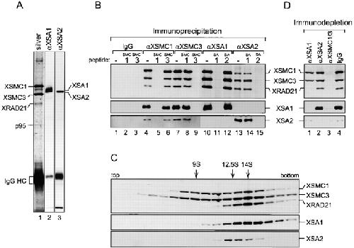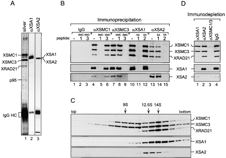 Figure 2. Biochemical characterization of Xenopus cohesin complexes containing XSA1 and XSA2. (A) Cohesins were immunoprecipitated from a Xenopus egg HSS using anti-XSMC3 antibodies and analyzed by silver staining (lane 1) and immunoblotting with anti-XSA1 (lane 2) or anti-XSA2 (lane 3). (B) Immunoprecipitations were performed using antibodies against XSMC1 (lanes 4–6), XSMC3 (lanes 7–9), XSA1 (lanes 10–12), XSA2 (lanes 13–15), or control rabbit IgG (lanes 1–3). The antigen peptides for XSMC1 (lanes 2, 5, and 8), XSMC3 (lanes 3, 6, and 9), XSA1 (lanes 11 and 14), or XSA2 (lanes 12 and 15) were added at 0.4 mg/ml to demonstrate the specificity of these reactions. The immunoprecipitates that were recovered on protein A agarose beads were analyzed by immunoblotting using the antibodies indicated. (C) An interphase HSS was fractionated in a 5–20% sucrose gradient centrifuged at 36,000 rpm for 15 h in an SW50.1 rotor (Beckman), and fractions were analyzed by immunoblotting. The peaks corresponding to x-cohesinSA1 (14S), x-cohesinSA2 (12.5S), and the XSMC1-XSMC3 heterodimer (9S) are indicated. (D) Aliquots of an HSS were immunodepleted using anti-XSA1 (lane 1), anti-XSA2 (lane 2), and a mixture of anti-XSMC1 and anti-XSMC3 (lane 3) or control rabbit IgG (lane 4), and analyzed by immunoblotting.