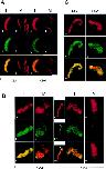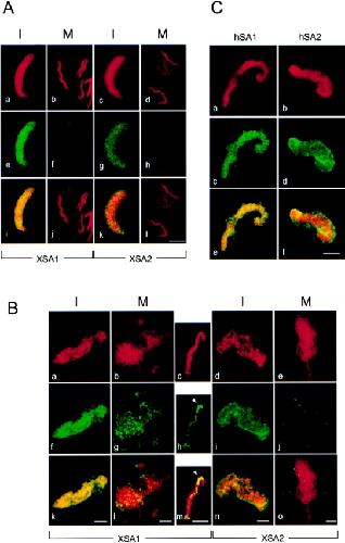 Figure 4. Localization of cohesin complexes in nuclei and chromosomes assembled in Xenopus egg extracts. (A) Xenopus sperm chromatin was incubated in interphase or mitotic HSS. The assembled interphase chromatin (I) and mitotic chromosomes (M) were fixed, isolated through a glycerol cushion, and immunostained with anti-XSA1 (e and f, green) or anti-XSA2 (g and h, green). The DNA was counterstained with DAPI (a–d, red). Merged images are also shown (i–l). (B) Xenopus sperm chromatin was incubated at 22°C for 90 min in interphase LSS, where it was replicated. Half of this interphase mixture (I) was fixed and processed for immunostaining with anti-XSA1 (a, f, and k) or anti-XSA2 (d, i, and n). The other half was driven into mitosis (M) by the addition of a mitotic LSS, incubated for another 2 h, fixed, and immunostained. A mass of entangled chromosomes (b, g, l, e, j, and o) and an individual chromosome (c, h, and m) are shown. (a–e, red) DNA; (f–h, green) anti-XSA1; (i and j, green) anti-XSA2; (k–o) merged images. Stronger staining with anti-XSA1 was often observed on a bent region of the chromosome, most likely corresponding to the pericentromeric region (arrowhead). The images of antibody staining were captured using different exposure times to visualize weak signals on the mitotic chromosomes and, therefore, the label intensities cannot be compared quantitatively. (C) Xenopus sperm nuclei were incubated in an interphase LSS depleted of x-cohesins and supplemented with h-cohesinSA1 and h-cohesinSA2. After incubation at 22°C for 90 min, the nuclei were fixed, and hSA1 and hSA2 were detected with anti-XSA1 and anti-XSA2, respectively. (a and b, red) DNA; (c and d, green) antibody staining; (e and f) merged images. Bars, 5 μm.