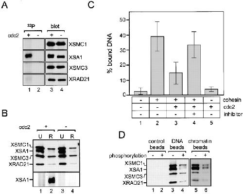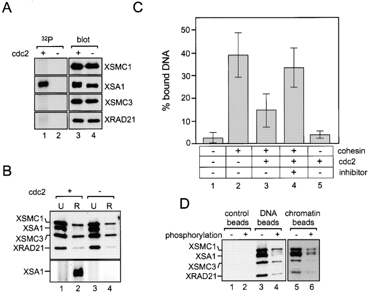 Figure 7. Phosphorylation of x-cohesin by cdc2-cyclin B and its effect on DNA binding. (A) Xenopus cohesins were immunoprecipitated from an interphase HSS with anti-XSMC3, and incubated with purified cdc2-cyclin B (lanes 1 and 3) or no kinase (lanes 2 and 4) in the presence of γ-[32P]ATP. After washing, the immunoprecipitates were separated by SDS-PAGE and analyzed by autoradiography (lanes 1 and 2) or by immunoblotting (lanes 3 and 4). (B) Solid-phase chromatin was assembled on DNA-coupled magnetic beads in an interphase HSS, washed, and treated with cdc2-cyclin B (lanes 1 and 2) or no kinase (lanes 3 and 4) in the presence of γ-[32P]ATP. After incubation at 22°C for 1 h, proteins remaining bound to the chromatin beads (lanes 1 and 3; unreleased [U]) and those dissociated from the beads (lanes 2 and 4; released [R]) were analyzed by immunoblotting with antibodies against cohesin subunits (top) or by autoradiography (bottom). (C) Filter binding assay. Purified cohesins were first treated with no kinase (lane 2), cdc2-cyclin B (lane 3), or cdc2-cyclin B in the presence of the CDK inhibitor roscovitine (lane 4), and then incubated with plasmid DNA in a low salt buffer. Buffer alone (lane 1) or cdc2-cyclin B alone (lane 5) were also mixed with plasmid DNA. The binding reactions were passed through glass fiber filters, and washed sequentially with low salt buffer, high salt buffer, and buffer containing SDS. The ratio of bound DNA to total DNA was calculated as described previously (Kimura et al. 1999). The average of values from three independent experiments was plotted with error bars. (D) Bead-binding assay. Unphosphorylated (lanes 1, 3, and 5) or phosphorylated (lanes 2, 4, and 6) cohesins were mixed with no-DNA beads (lanes 1 and 2; control beads), DNA-coupled beads (lanes 3 and 4; DNA beads), or solid-phase chromatin beads assembled in a cohesin-depleted interphase HSS (lanes 5 and 6; chromatin beads). After incubation for 1 h, the beads were washed and proteins bound to the beads were analyzed by immunoblotting.