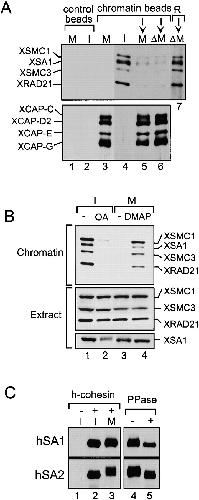 Figure 6. Regulation of cohesin by phosphorylation in the cell-free extracts. (A) DNA-coupled paramagnetic beads were incubated with mitotic (M) or interphase (I) HSS to assemble solid-phase chromatin (lanes 3 and 4). Uncoupled beads were treated in the same way as controls (lanes 1 and 2). After washing the beads, bound proteins were analyzed by immunoblotting with antibodies against cohesin (upper) and condensin subunits (lower). Alternatively, solid-phase chromatin was assembled in an interphase HSS, washed, and then placed in a mitotic HSS (lane 5; I > M) or a cohesin-depleted mitotic HSS (lane 6; I > ΔM). After incubation for 2 h, proteins bound to the beads were analyzed as above. The fraction released from the I > ΔM chromatin beads was immunoprecipitated with anti-XSMC3 and analyzed by immunoblotting (lane 7). (B) DNA-coupled beads were incubated with an interphase HSS (I) for 1 h (lane 1). Half of the reaction mixture was incubated for another 1 h after addition of okadaic acid to 1 μM (lane 2; OA). The DNA beads were also incubated in a mitotic HSS (M) without (lane 3) or with (lane 4) 5 mM 6-dimethylaminopurine (DMAP) for 2 h. The chromatin beads were separated from the extract and washed. Cohesin fractions, which were present in chromatin (top) or extracts (middle and bottom), were detected by immunoblotting with the indicated antibodies. (C) A Xenopus interphase LSS was immunodepleted of x-cohesins using anti-XSMC3. An aliquot of the depleted extract was saved to check the absence of x-cohesins (lane 1). The remainder was divided into two parts, and one of them was converted into a mitotic state by addition of cyclin BΔ90 (Glotzer et al. 1991). Both LSSs depleted of x-cohesins were supplemented with purified h-cohesinSA1 and h-cohesinSA2 (∼7.5 nM each). After incubation at 22°C for 90 min, aliquots were taken from the interphase (lane 2) and the mitotic (lane 3) extracts. The human cohesin complexes were recovered from the LSS by immunoprecipitation with anti-XSMC3, and treated with buffer alone (lane 4) or λ-phosphatase (lane 5) at 30°C for 1 h. The aliquots of the extracts and the immunoprecipitates were separated by SDS-PAGE, and hSA1 and hSA2 were detected by immunoblotting with anti-XSA1 (top) and anti-XSA2 (bottom), respectively.