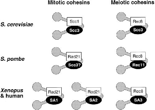 Figure 8. Mitotic and meiotic cohesins in different organisms. The subunit composition of S. pombe mitotic cohesin and the three meiotic cohesin complexes are hypothetical. The Scc1p/Rad21/Rec8-like subunits are shown by white rectangles, whereas the Scc3p/Rec11/SA-like subunits are indicated by black ovals. For simplicity, no distinction is made between SMC1 and SMC3, and the heterodimers are represented as symmetrical V-shaped structures.