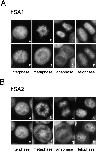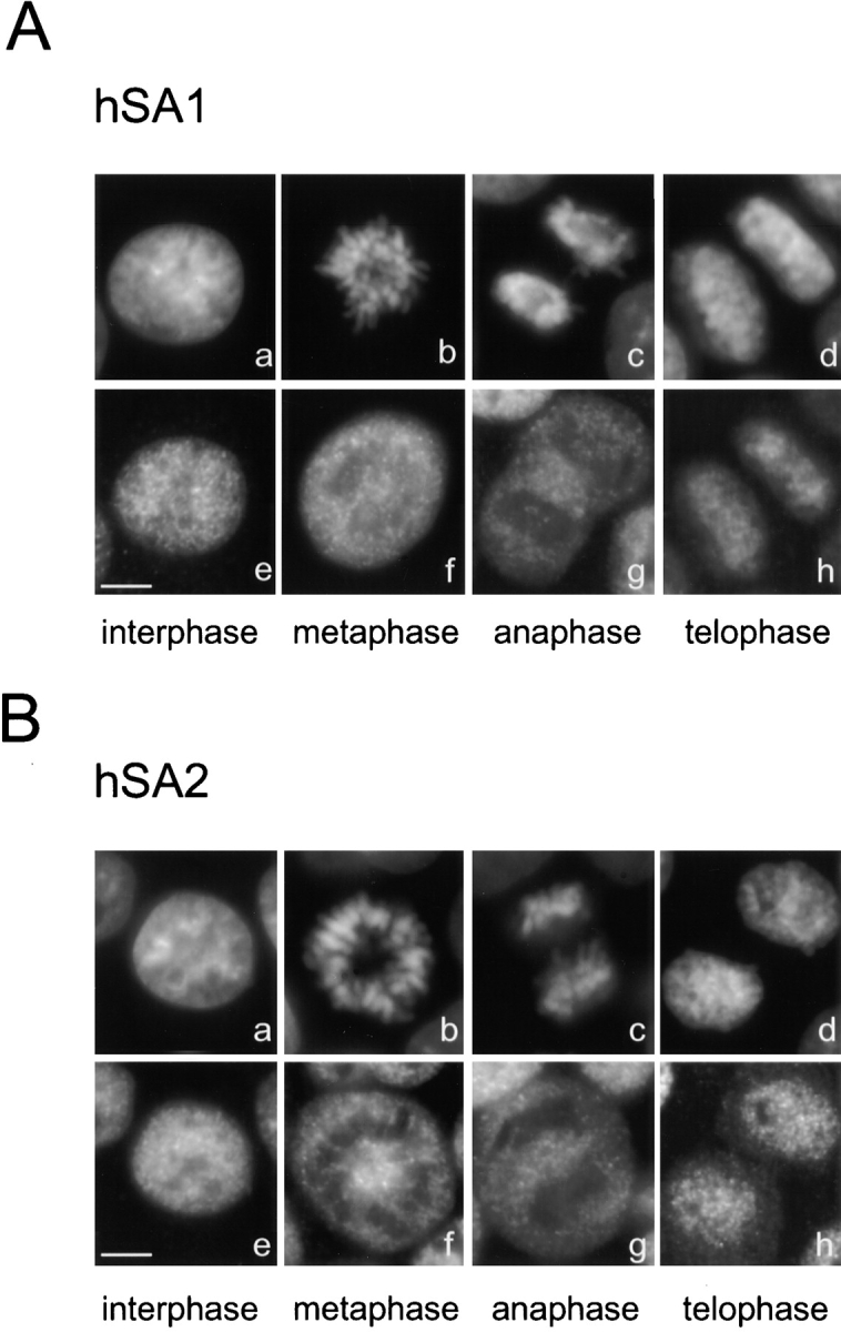 Figure 5. Localization of cohesin complexes in human tissue culture cells. HeLa cells were fixed with paraformaldehyde, and hSA1 (A) and hSA2 (B) were immunolocalized using anti-XSA1 and anti-XSA2, respectively. (a–d) DNA; (e–h) antibody staining. Bars, 5 μm.