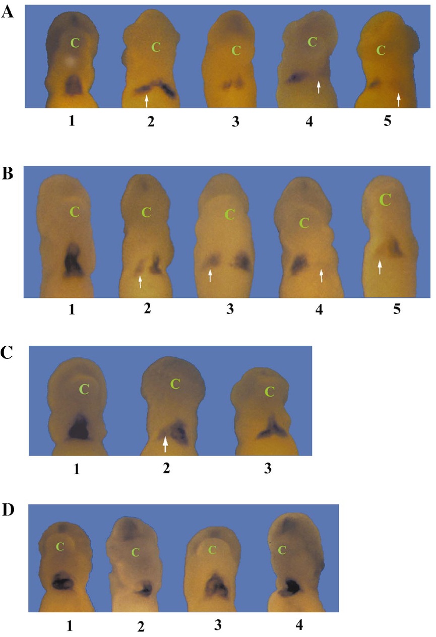 embryos harvested from stages 14 through 20 exhibited normal XNkx2-5 expression, as represented in A and B. Embryos from
