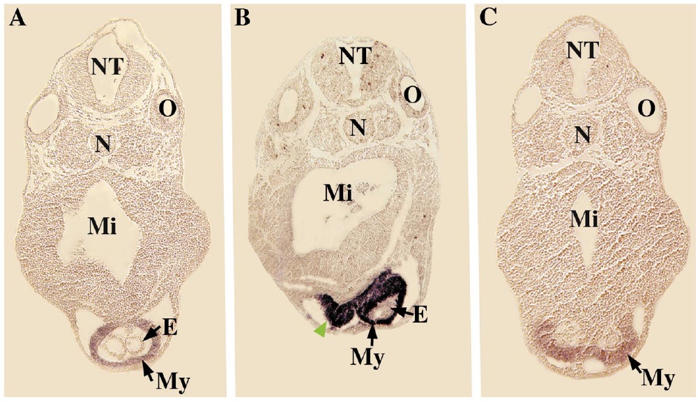 reveals partially fused heart tubes. E, endocardium; Mi, midgut; My, myocardium; N, notochord; NT, neural tube; O, otic vesicle.