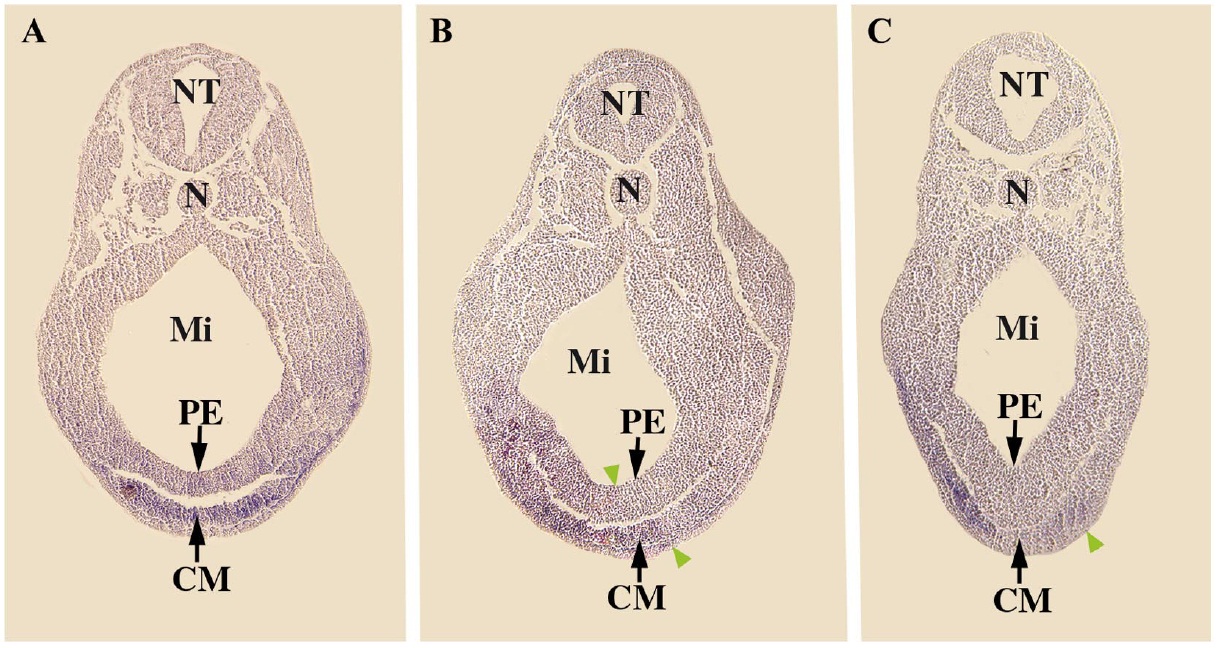 cardiogenic mesoderm; NT, neural tube; Mi, midgut; N, notochord; PE, pharyngeal endoderm.