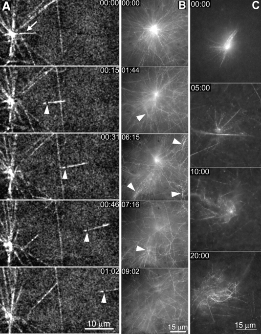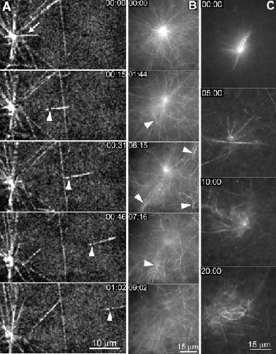 Figure 2. Microtubule gliding and aster expansion in Xenopus egg extracts. (A) FSM of astral microtubule release and gliding along the substrate. The microtubule nucleated at the aster center (arrow) grows several microns and is then released at its minus end from the aster. The dark gap (arrowhead) in the speckled microtubule moves relative to the substrate demonstrating that the microtubule is translocating away from the aster via the action of a minus endâdirected motor on the coverslip. (B) Low magnification, time-lapse view showing expansion of a sperm aster. Immediately after the initiation of imaging, the aster is well organized into a radial array containing many microtubules. Over time, microtubules are released and translocate away from the aster, and small radial arrays of microtubules (arrowheads) wander away from the original aster. (C) Low magnification, images of asters that were formed by adding demembranated sperm to extracts in solution and fixed at the time point shown and then placed in a slide-coverslip chamber. At the earliest time point, asters are well focussed, similar to those observed in thin preparations (see B). At the 5-min time point, asters have expanded, and the microtubules do not extend from a single, well-defined point. At 10- and 20-min time points, expansion and disorganization is even more pronounced. Time is in min/s. Also see supplemental videos 4 and 5 at http://www.jcb.org/cgi/content/full/150/2/361/DC1. |