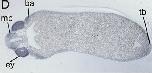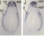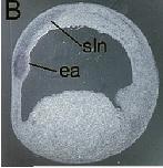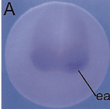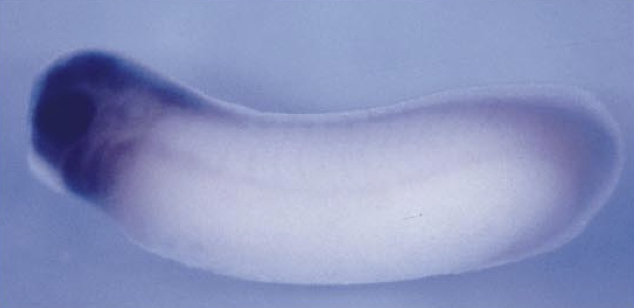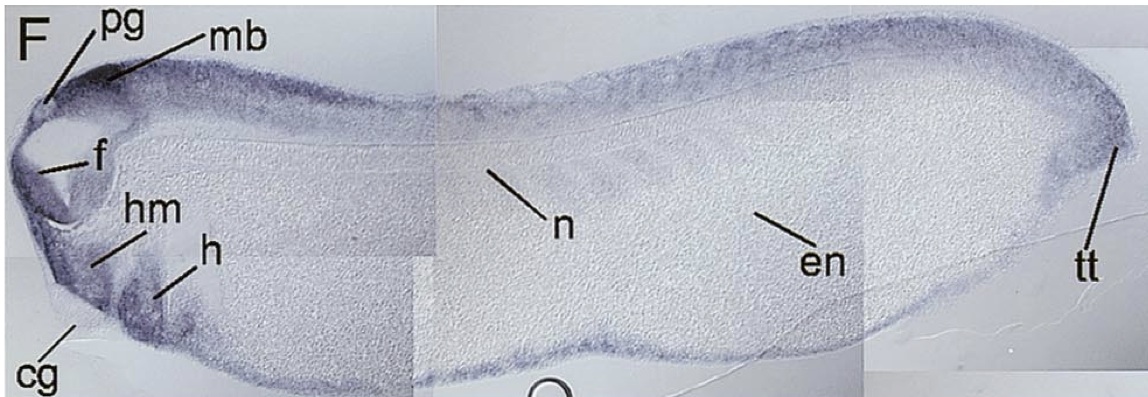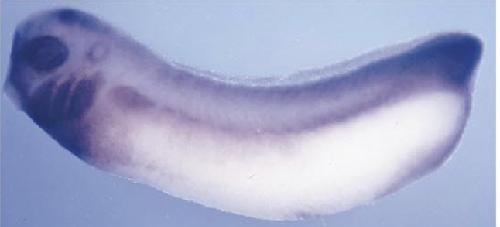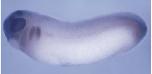 ipo5 ( importin 5 ) gene expression in bisected Xenopus laevis embryo, mid-sagittal section, assayed via in situ hybridization, NF stage 16, dorsal up, anterior left.