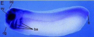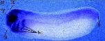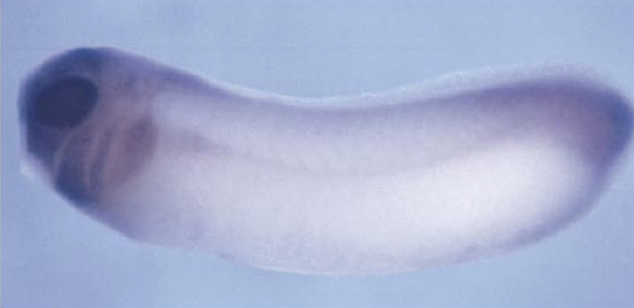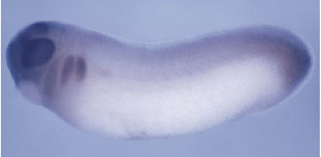ranbp1 (RAN binding protein 1 ) gene expression in Xenopus laevis embryo, assayed via in situ hybridization, NF stage 28, lateral view, anterior left, dorsal up.