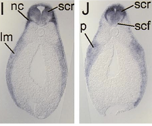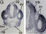 Fig. 2. Expression of karyopherin-β3 in Xenopus embryos. Whole-mount in situ hybridisation with Xenopus karyopherin-β3 antisense RNA. (A) A frontal view and (B) a parasagittal section at the neural fold level (stage 16) show strong expression of karyopherin-β3 in the ea, eye-Anlage and weaker expression in the sln, sensorial layer of the neuroectoderm. (C) A lateral view of a stage 23 embryo reveals karyopherin-β3 transcripts in the ey, eye, ba, branchial arches and in the tb, tailbud. No expression is visible in the cg, cement gland. (D) A horizontal section of stage 23 shows strong expression in the eye and branchial arches. Lower expression levels are detectable in the mb, midbrain and tb, tailbud. (E) In a stage 29 embryo (also shown in FâJ) karyopherin-β3 transcripts are localized in the eye, the branchial arches, the tt, tailtip and in the fore-/midbrain regions exept the pg, pineal gland. (F) In the parasagittal section of a late tailbud embryo, karyopherin-β3 expression is visible in the h, heart, tailtip, f, forebrain, midbrain and hm, head mesenchyme. No expression is detectable in the cement gland, n, notochord and en, endoderm. (G) The frontal section of the eye/midbrain level shows strong expression enhancement in the eyes and dorsal regions of the midbrain, a weaker signal is detected in the midbrain floor and hm, head mesenchym. No expression is visible in the cement gland, sa, stomodeal anlage and pineal gland. (H) Partial magnification of (G) shows a differential distribution of the midbrain and no signal in the ep, epidermis. (I) Frontal section just behind the head with strong expression in the nc, neural crest, scr, spinal chord roof, and lm, lateral mesoderm. (J) Posterior section of the embryo. The expression in neural crest cells becomes weak. Enhancement of expression is visible in the p, pronephros region and in the spinal cord roof, weak expression is detectable in the scf, spinal chord floor.