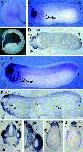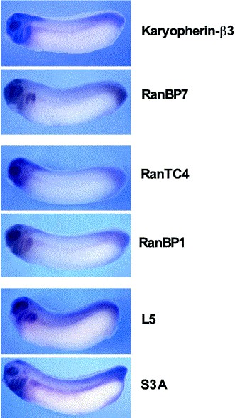 Fig. 3. Common expression characteristics of ribosomal proteins and nuclear import factors. Whole-mount in situ hybridisation analysis was performed using antisense RNAs corresponding to the entire coding region for karyopherin-β3, RanBP7, RanBP1 and L5. Partial antisense sequences were used for in situ hybridization analysis of RanTC4 and S3A. The presented examples were grouped into three classes: transport factors (karyopherin-β3 and RanBP7), transport factor associated proteins (RanTC4 and RanBP1) and ribosomal proteins (L5 and S3A). Early tailtip stages (29â30) are shown in lateral view.