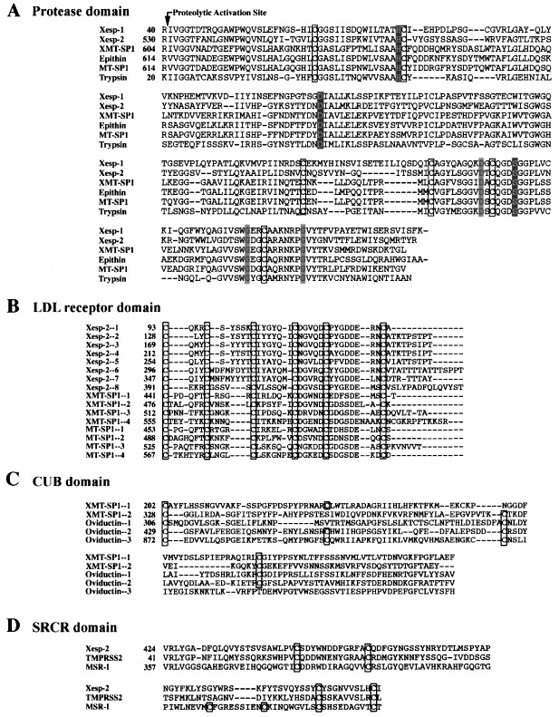 Multiple sequence alignments of the structural motifs. (A) Alignment of the serine protease domains of Xesp-1, Xesp-2, and XMT-SP1 with Epithin, MT-SP1, and Trypsin. The catalytic triad residues (His, Asp, Ser) are in black. The residues of the substrate binding pocket are in gray. (B) Alignment of the LDL receptor domains of Xesp-2 and XMT-SP1 with MT-SP1. (C) Alignment of the CUB domains of XMT-SP1 with oviductin. (D) Alignment of the SRCR domain of Xesp-2 with TMPRSS2 and mouse macrophage scavenger receptor type I. (A–D) The boxes indicate the conserved Cys residues.