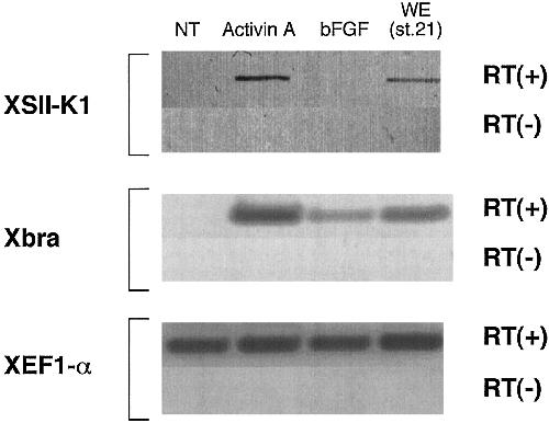 Activation of the XSII-K1gene by activin A. RNA was extracted from animal caps treated with activin A or bFGF and subjected to RT-PCR to detect XSII-K1 (top), Xbra (middle), or XEF1-α mRNA (bottom). NT, embryos incubated without activin A or bFGF; WE, control embryos at stage 21.RT(+) and RT(â) indicate experiments with or without RT reaction.