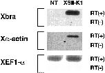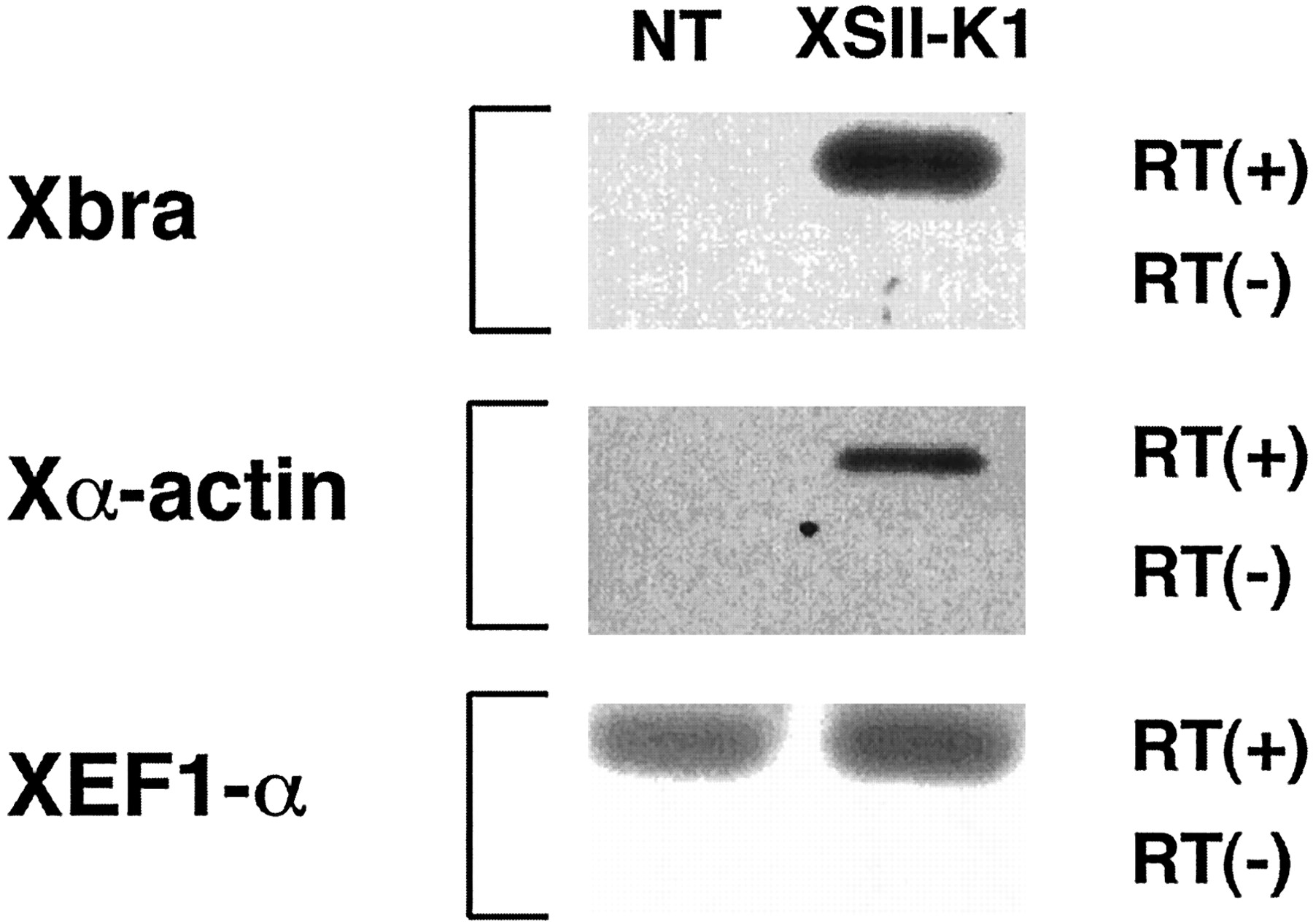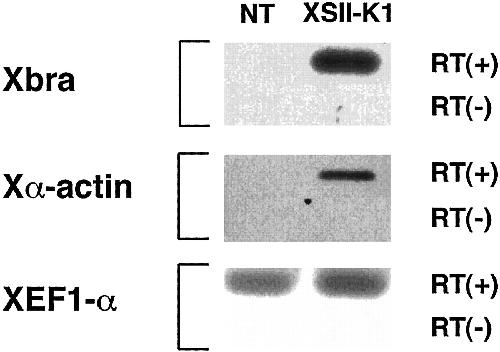 Induction of expression of the mesoderm marker genes (Xbra andXα -actin) by injection of XSII-K1 mRNA. XSII-K1 mRNA was injected into the animal pole of embryos at stage 1 (one-cell stage). Animal caps were dissected at the neurula stage and incubated for 24 h. Total RNA was extracted from the animal caps, and expression of the Xbra(top), α-actin (middle), and XEF1-α (bottom) genes was detected by RT-PCR. NT, animal caps from non-treated embryos.RT(+) and RT(â) indicate experiments with or without RT reaction.
