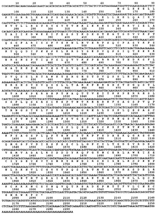 Nucleotide and deduced amino acid sequences of the XSII-K1 cDNA. The deduced amino acid sequences are shown below the nucleotide sequence. The nucleotides are numbered from the 5′-end of the cDNA. The termination codon is indicated by an asterisk.