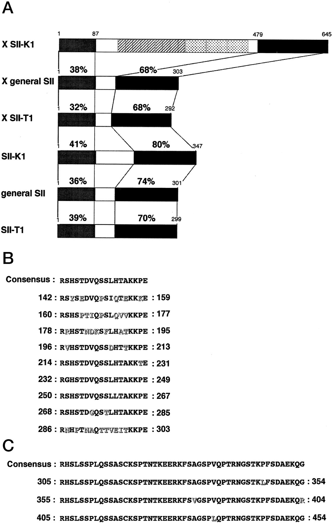 A, schematic illustrations of S-II family proteins from Xenopus and mouse. The N-terminal and C-terminal conserved regions are shaded, and the sequence homology relative to the sequence of the novel S-II is givenabove each region. Two repeated sequences in the novel S-II are shown by hatched and dotted boxes. Thenumbers indicate amino acid residues. B,alignment of the short repeated sequences (18 residues). Identical residues are shown blocked and consensus sequences are at the top. C, alignment of the long repeated sequences (50 residues).