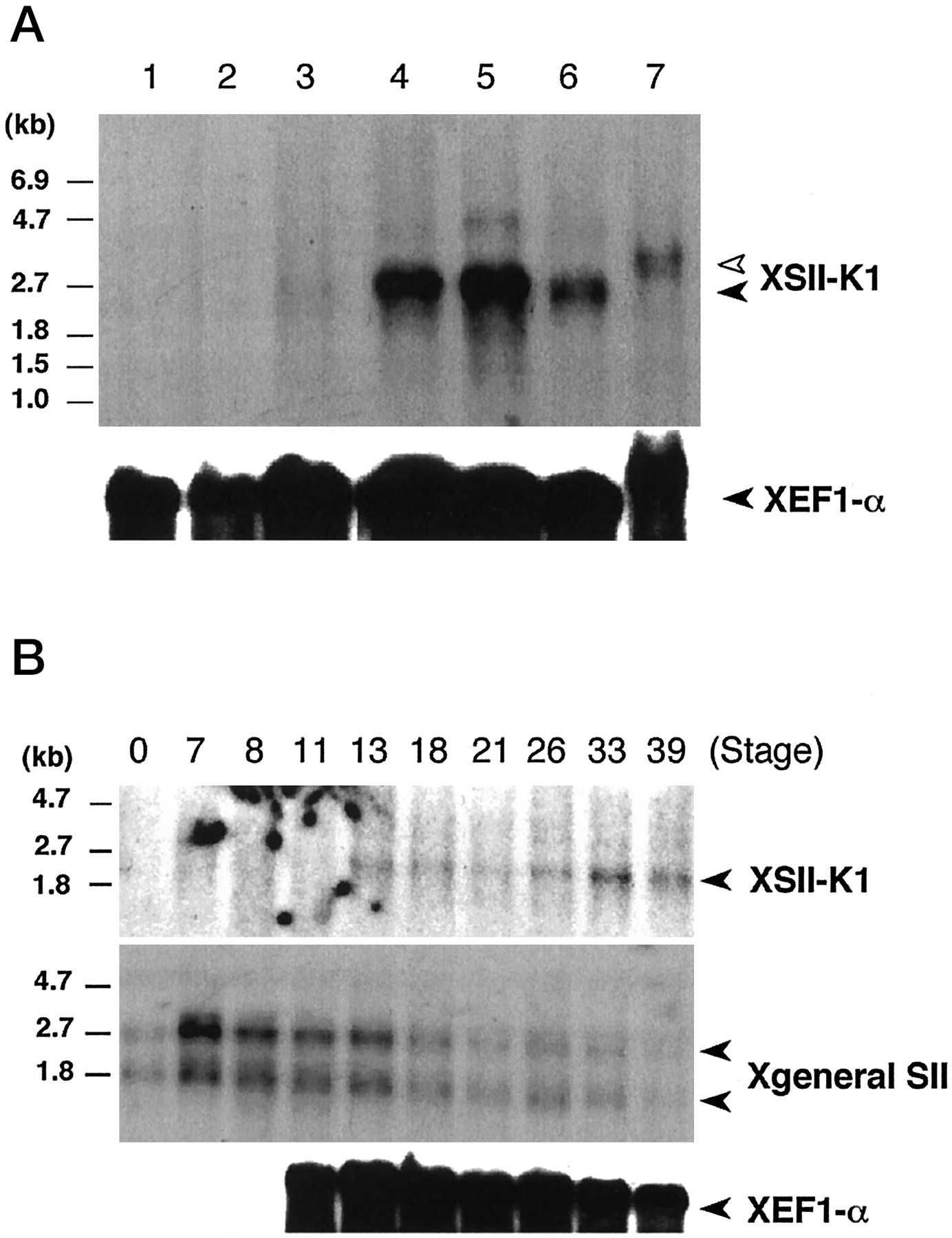 Tissue-specific and developmental stage-specific expression of the XSII-K1 gene. A, Northern blotting analysis of RNA from various tissues. Each lane contained 2 μg of RNA and was hybridized with XSII-K1 (top) and XEF1-α (bottom) probes. Tissues used are as follows: lane 1, heart; lane 2, brain;lane 3, spleen; lane 4, liver; lane 5, skeletal muscle; lane 6, kidney; lane 7, testis. The position of XSII-K1 mRNA (2.5 kb) is indicated by thearrowhead. White arrowhead shows a relatively thick band in the testis. B, Northern blotting analysis of RNA from the embryos at various developmental stages. Probes used are XSII-K1 (top), Xenopus general S-II (middle), and XEF1-α (bottom). Lane numbers at the top correspond to the developmental stages of the embryos.