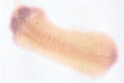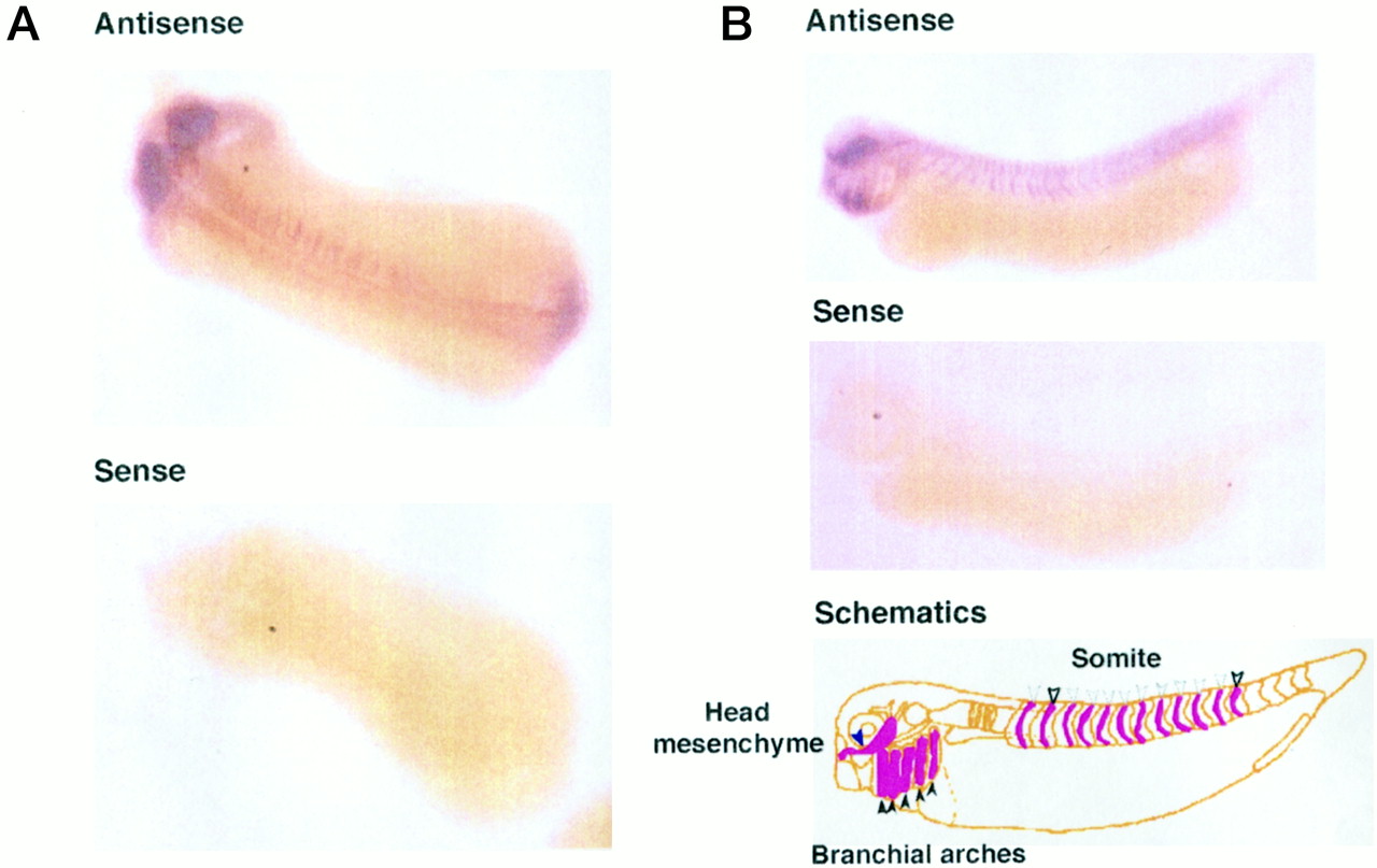 Whole mount in situhybridization of XSII-K1 mRNA. Embryos at the neurula stage (A), and tail bud stage (B) were treated with the antisense or sense probe of XSII-K1. For hybridization-positive tissues, headmesenchyme, somite, and branchial arches are indicated by blue, white, andblack arrowheads, respectively. Illustration represents a tail-bud stage embryo.