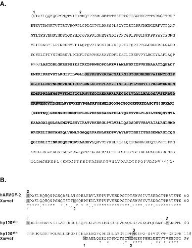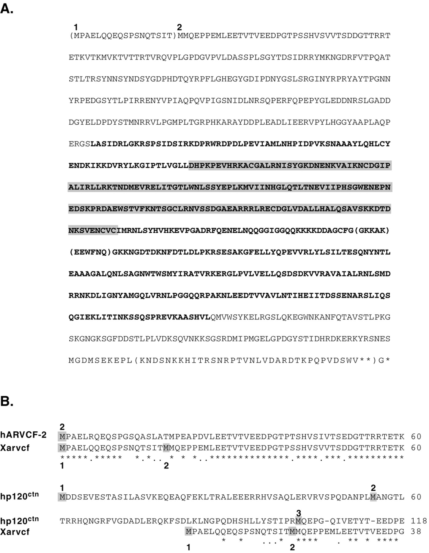 Xarvcf sequence. A, deduced amino acid sequence of Xenopus ARVCF (Xarvcf). Sequence inboldface type represents the central Armadillo domain,shaded sequence indicates the original PCR clone, andparentheses indicate sequence resulting from alternative splicing within the transcript. The sequence data is available from GenBank™ under accession number AF287051. B, alignment of Xarvcf N-terminal sequence with human ARVCF-2 and human p120ctn1.