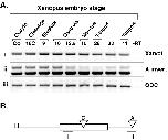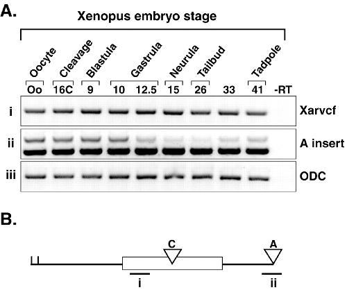 RT-PCR analysis of Xarvcf expression in earlyXenopus development. A: i, semiquantitative RT-PCR evaluation of total Xarvcf expression at the indicated developmental stages. ii, C-terminal RT-PCR to evaluate the presence of Xarvcf insert A (upper band) during early developmental stages. Without insert A, the PCR band is 216 bp, and, when insert A is present, a PCR product of 333 bp is observed.iii, control RT-PCR reaction of ornithine decarboxylase was used as a loading control. B, Xarvcf schematic to illustrate location of PCR primers within the Xarvcf sequence.