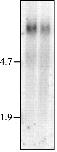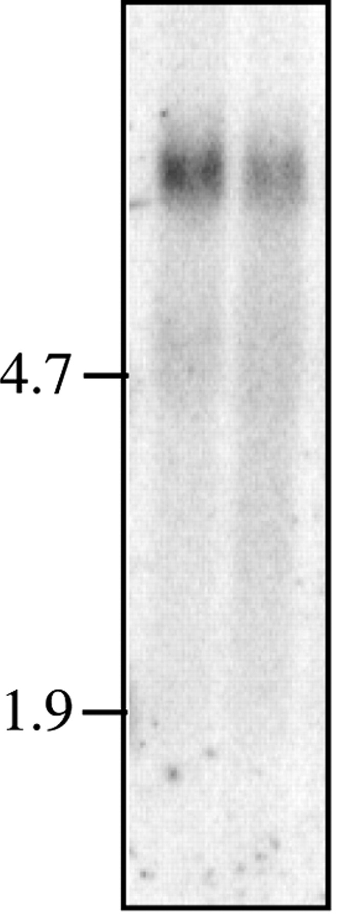 Northern blot analyis of Xarvcf mRNA expression in the Xenopus oocyte. Xarvcf transcripts migrate as a diffuse collection of bands at approximately 6 kb. Each lane contains 5 μg of total RNA isolated from different sets of oocytes.