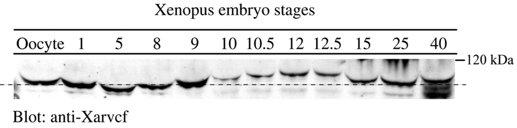 Immunoblot analysis of Xarvcf protein at the indicated embryonic stages. Xarvcf protein in total embryo extracts isolated in the presence of phosphatase inhibitors was detected using affinity-purified anti-Xarvcf peptide polyclonal antibody. The anti-Xarvcf antibody recognizes two major bands at about 100 kDa, the upper band being the most prominent. There is a shift in gel mobility of Xarvcf protein in early development, increasing during cleavage stages (stage 5) and decreasing during gastrulation (stages 10–12.5), likely reflecting developmentally regulated post-translational modification to Xarvcf.
