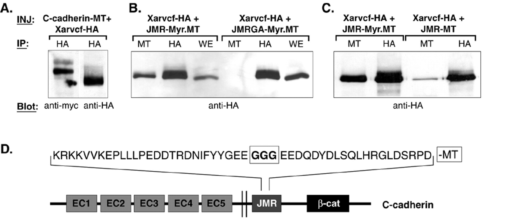 Xarvcf binds to the juxtamembrane region of C-cadherin. A, embryos were injected with mRNA coding for Xarvcf-HA (isoform 1B was used for all of these experiments with hemagglutinin epitope tag) and C-cadherin-MT (myc epitope tag) and were immunoblotted for C-cadherin-MT and Xarvcf-HA following immunoprecipitation of Xarvcf-HA. B, embryos were injected with mRNA coding for Xarvcf-HA and either the membrane targeted C-cadherin JMR-Myr.MT or the mutant C-cadherin JMRGA-Myr.MT. Following immunoprecipitation of C-cadherin JMR-Myr.MT or C-cadherin JMRGA-Myr.MT, the coimmunoprecipitation of Xarvcf-HA protein was detected from Xenopus whole embryo lysates blotted with anti-HA monoclonal antibody. Xarvcf coimmunoprecipitates with membrane-targeted C-cadherin JMR-Myr.MT but not with the mutant construct JMRGA-Myr.MT. C, embryos were injected with mRNA coding for Xarvcf-HA and either the membrane-targeted C-cadherin JMR-Myr.MT or the non-membrane-targeted C-cadherin JMR-MT, lacking the myristylation motif. Immunoprecipitation of JMR-Myr.MT and JMR-MT followed by immunoblotting for Xarvcf-HA showed that the interaction of Xarvcf is stronger with the membrane-localized construct. D, the sequence of the juxtamembrane domain of C-cadherin used to test the interaction of Xarvcf with C-cadherin. Theboxed glycine residues were mutated to alanines for the construct JMRGA-Myr.MT.