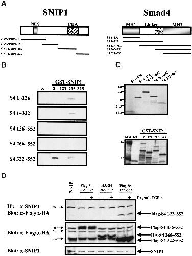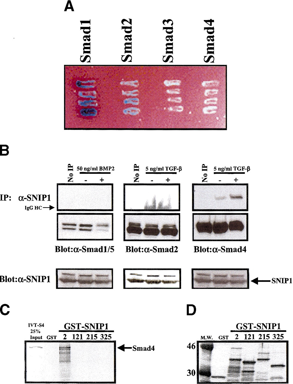 Figure 2. SNIP1 interacts with Smad proteins in vivo and in vitro. (A) Truncated SNIP1 cloned from the yeast two-hybrid assay was cloned into the prey vector pJG4-5 and was transformed into yeast. The truncated SNIP1 transformants were then transformed again with the indicated LexAâSmad fusion constructs in the bait construct pEG202. Four separate colonies from each group of transformants were streaked. (Blue) A positive interaction was detected for the transformants of SNIP1/Smad1 and SNIP1/Smad2. (B) NMuMg cell lysates treated with or without 5 ng/ml TGF-β or 50 ng/ml BMP2 for 1 hr was subjected to immunoprecipitation with α-SNIP1 and blotted with antibodies against indicated Smads. No IP lane was immunoprecipitated with rabbit IgG. The presence of SNIP1 and Smads in these cells were monitored by direct immunoblotting using antibodies against SNIP1 and Smads. (C) In vitro product of Smad4 made using reticulocyte lysate was incubated with various GSTâSNIP1 deletion constructs. (Arrow) Smad4 product. (D) GSTâSNIP1 (25%) constructs used in the reactions were subjected to SDS-PAGE and stained.