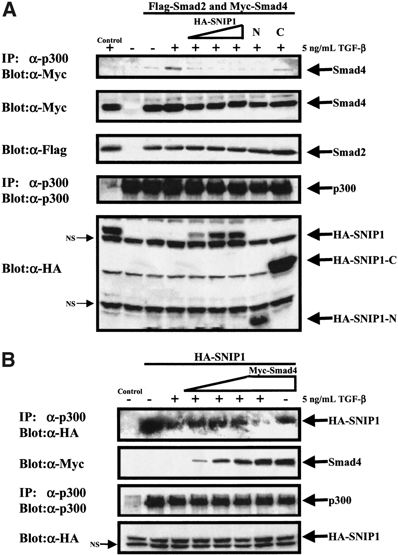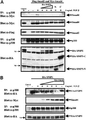 Figure 7. SNIP1 is able to inhibit the interaction of Smad4 with p300. (A) NMuMg cells were transfected with HA-tagged SNIP1 constructs and indicated Flag-tagged full-length Smad2 and Myc-tagged Smad4 expression constructs. The activation of the system was achieved by treating the cells with (+) or without (â) 5ng/ml TGF-β for 1 hr before lysis. Interaction between p300 and Smad4 was analyzed by immunoblotting the α-p300 immunoprecipitates with α-Myc antibody. The amount of immunoprecipitated p300 was monitored by immunoblotting 25% of p300 immunoprecipitate with α-p300 antibody. The expression of the transfected constructs was monitored by immunoblotting with antibodies against HA for SNIP1 or Myc and Flag for Smads. The control lane was immunoprecipitated with normal rabbit IgG. (B) COS-1 cells were transfected with HA-tagged SNIP1 constructs and increasing amounts of Myc-tagged Smad4 expression construct. The activation of the system was achieved by treating the cells with (+) or without (â) 5ng/ml TGF-β for 1 hr before lysis. Interaction between p300 and SNIP1 was analyzed by immunoblotting the α-p300 immunoprecipitates with α-HA antibody. The amount of immunoprecipitated p300 was monitored by immunoblotting 25% of p300 immunoprecipitate with α-p300 antibody. The expression of the transfected constructs was monitored by immunoblotting with antibodies against HA for SNIP1 or MycSmad4. The control lane was immunoprecipitated with normal rabbit IgG.