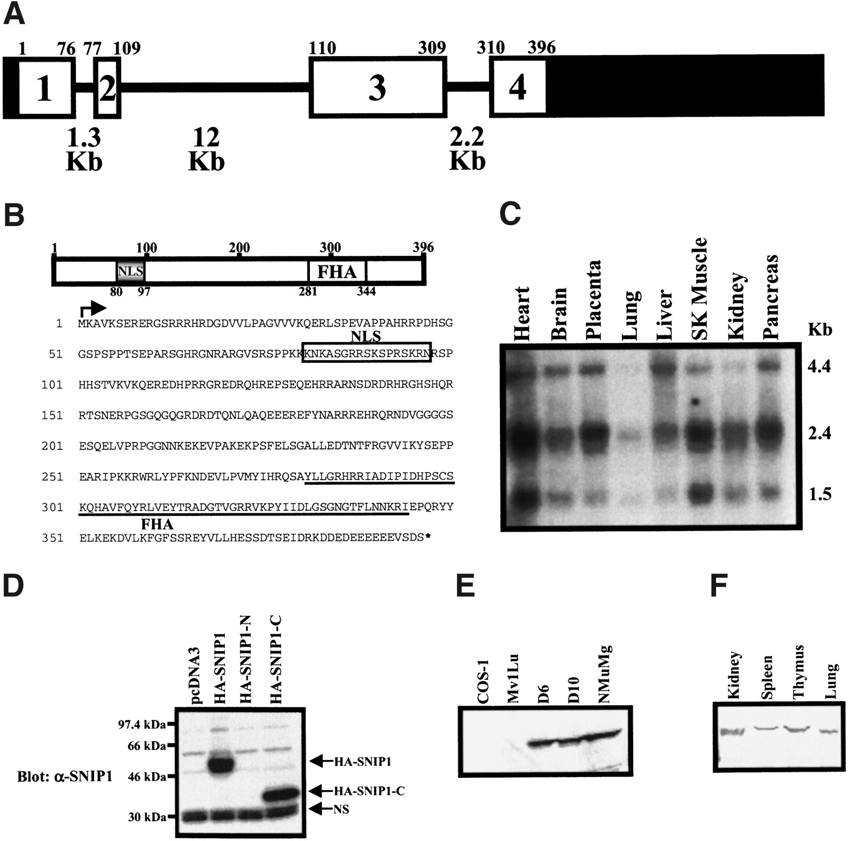 Figure 1. Cloning and characterization of SNIP1. (A) Putative genomic structure of human SNIP1 gene is shown. Black boxes represent untranslated regions and the white boxes represent translated regions. The exon numbers are noted inside their respective white boxes with the sizes of introns written at the bottom. Numbers at the edges of the boxes denote the amino acid number from the human protein sequence. (B) Schematic diagram of human SNIP1 protein is shown with two conserved domains noted in shaded boxes, which are a bipartite NLS and a FHA. Numbers at the edges of the boxes denote the amino acid number from the deduced protein sequence. The sequence of the human SNIP1 protein is shown with the arrow indicating the starting methionine and an asterisk star representing the stop codon. The NLS is enclosed in a box and the FHA domain is underlined. (C) Commercially available Northern blot was purchased from Clontech and hybridized with the carboxy-terminal fragment of SNIP1. The sizes of three transcripts are indicated. (D) COS-1 cells were transfected with HA-tagged SNIP1 constructs as indicated. The specificity of an antibody against SNIP1 was monitored by Western blotting of the lysates. HAâSNIP1 and HAâSNIP1-C are indicated by arrows. (NS) Nonspecific band. (E) Western blot of cell lysates from various cell lysates. A single band of â¼50 kD was detected. (F) Western blot of lysates from various adult mouse tissues.