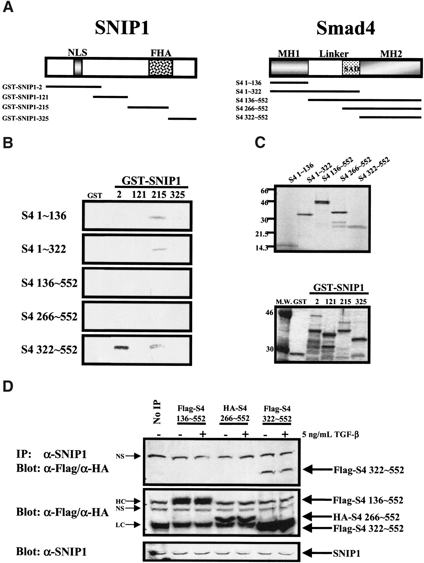 Figure 3. Deletion mapping of the interacting regions of SNIP1 and Smad4. (A) Schematic diagram of the SNIP1 protein with the GST fusion protein of SNIP1 deletion constructs used in these experiments shown below (left). Numbers indicate the starting amino acid number of the deletion constructs. Smad4 and its deletion constructs used to produce in vitro transcribed/translated products used in the experiment (right). (B) Smad4 deletion constructs from the above diagram were used to make protein using reticulocyte lysate. The Smad4 deletion proteins were used in in vitro-binding assay using various bacterially expressed GST fusion of SNIP1 deletions constructs as indicated. After extensive washing, the beads were subjected to SDS-PAGE and autoradiography. (C) Twenty-five percent of the reticulocyte lysates used in the reaction was subjected to SDS-PAGE and autoradiography to monitor for expression of Smad4 constructs (top) GST fusion proteins (25%) were also subjected to standard SDS-PAGE and stained as per experimental protocol to control for equal loading of proteins in the experiments (bottom). (D) NMuMg cell lysates transfected with the indicated deletion constructs Smad4 were treated with or without 5 ng/ml TGF-β for 1 hr. These lysates were subjected to immunoprecipitation with α-SNIP1 and blotted with α-Flag and α-HA. No IP lane was immunoprecipitated with rabbit IgG. The presence of SNIP1 in these cells was monitored by direct immunoblotting using antibodies against SNIP1. These lysates were also used for direct immunoblotting with antibodies against Flag and HA to determine the expression of transfected Smad4 deletion constructs. HC and LC denote heavy and light chain of mouse IgG, respectively. (NS) Nonspecific band.