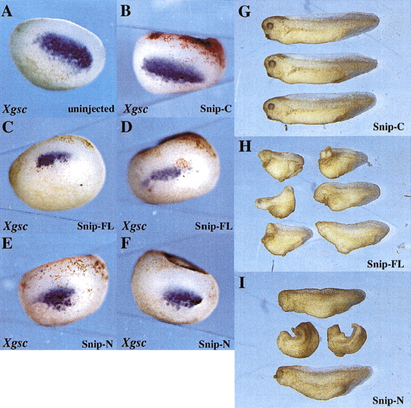 Figure 5. Injection of SNIP1 into Xenopus embryos leads to a suppression of Gsc expression and anterior truncations. A total of 1 ng of SNIP1-FL (C,D,H), or SNIP1-N (E,F,I) or 2 ng of SNIP1-C (B,G) RNA were injected into the two dorsal blastomeres of a 4-cell embryo. Embryos were allowed to develop until stage 10.5 and fixed for whole mount in situ analysis for Xgscexpression, or embryos were cultured until stage 33, fixed, and photographed. SNIP1-FL or SNIP1-N-injected embryos exhibited a suppression of Xgsc expression as compared with the uninjected control (A) or to the SNIP1-C injected embryos. At stage 33, SNIP1-C injected embryos were phenotypically normal, whereas SNIP1-FL and SNIP1-N-injected embryos often showed loss of anterior structures.