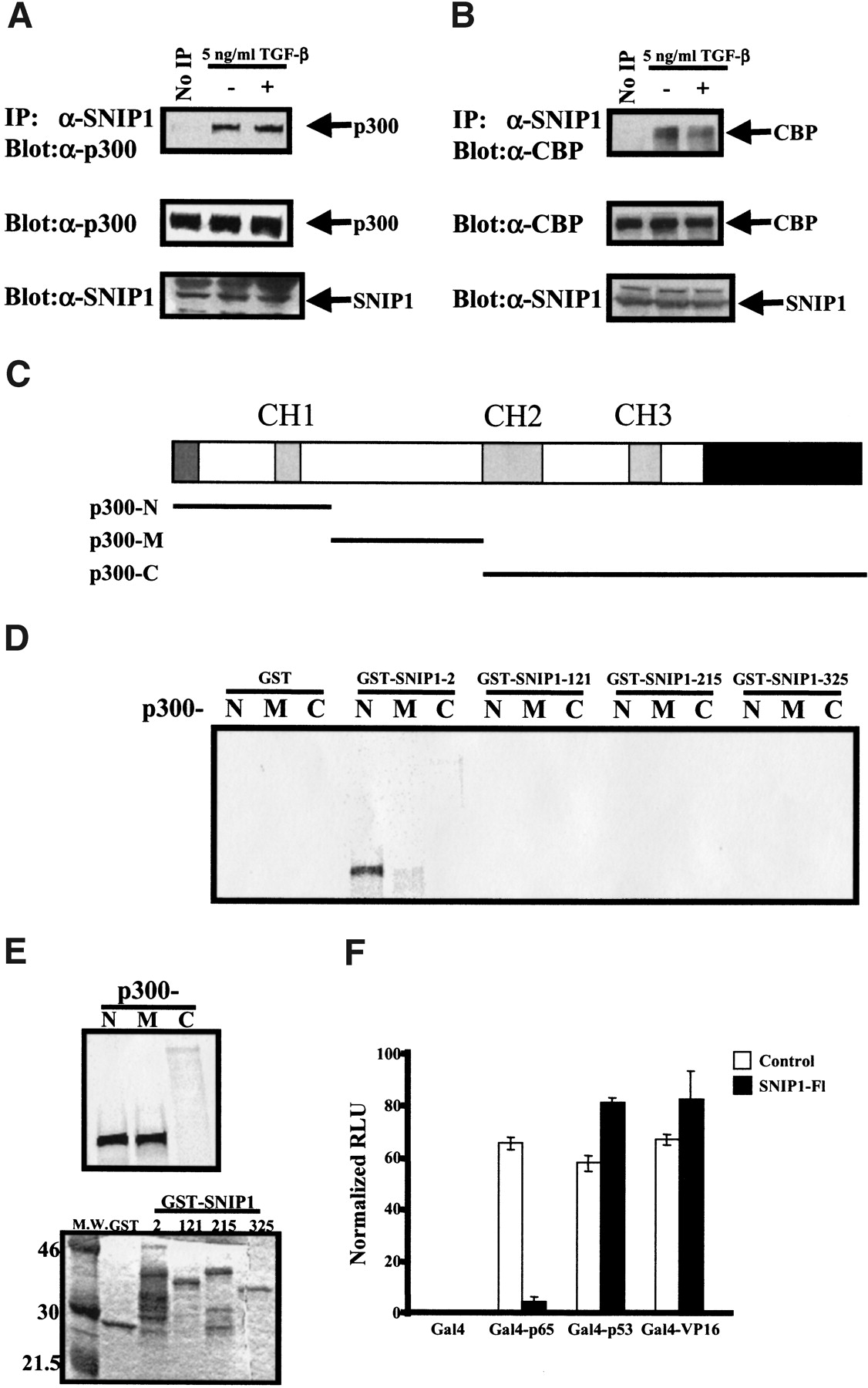 Figure 6. Endogenous SNIP1 interacts with endogenous CBP/p300 through its amino terminus. NMuMg cell lysates treated with or without TGF-β were subjected to immunoprecipitation using α-SNIP1 and blotted with α-p300 (A) or α-CBP (B). The expression of these proteins in the cells was monitored by direct immunoblotting as shown at bottom. (C) Schematic diagram of p300 and location of the deletion constructs used to make an in vitro-transcribed/translated product. (D) p300 deletion constructs from the above diagram were used to make protein using reticulocyte lysate. The p300 deletion proteins were used in in vitro-binding assay using various bacterially expressed GST fusion of SNIP1 deletions constructs as indicated. After extensive washing, the beads were subjected to SDS-PAGE and autoradiography. (E) A total of 25% of the reticulocyte lysates used in the reaction was subjected to standard SDS-PAGE and autoradiography to detect the amounts used in each reactions (top). A total of 25% of GST fusion proteins used in the experiments was subjected to standard SDS-PAGE and stained as per experimental protocol to control for equal loading of GST proteins in the experiments (bottom). (F) NMuMg cells were cotransfected with pG5E1B with (+) or without (â) 0.5 μg of HAâSNIP1-FL, as indicated along with Gal4 fusion proteins of p65, p53, and VP16. Results are expressed as means (±s.d) of triplicate assays, normalized for transfection efficiency using β-Galactosidase activity.