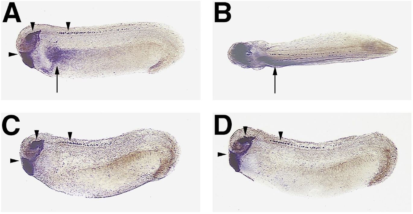 left. (B) Dorsal view, anterior to left. (A, B) Normal XPitx2 expression in the left lateral plate mesoderm (arrows), as well as in the head and